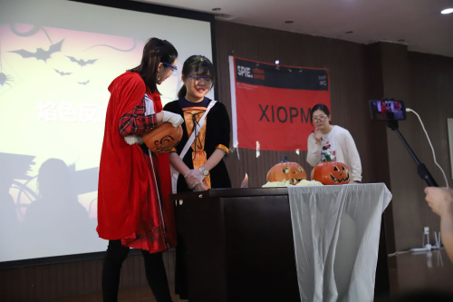 上午九点钟,活动准时开始。西安光机所王超博士作了《高速成像技术:解开超快现象的神秘面纱》精彩科普报告,他为大家解密了分幅相机、条纹相机等尖端高速成像技术背后的“简单且直观”的科学原理,特别讲解了阿秒脉冲作为新型光源在电子微观运动超快成像领域的应用,以阿秒光开关极高速信息处理技术为例,展示了阿秒光源作为改造自然的尖兵利器,在更新自然认知、提高人类福祉方面的可期前景。随后,科普团队用生活中简单易得的素材,巧妙地融合知识和趣味,通过“炫彩烟花秀” “液氮蘑菇云”“神奇变声”“火云掌”“空气大炮”等一系列丰富多彩的科学实验表演,让公众亲眼见证了光的奇迹和科学的魅力,现场同学们热情高涨,积极参与互动。科普剧《Trick or treat》让大家近距离观看到几种常见实验的变化过程,引得现场一片欢呼。