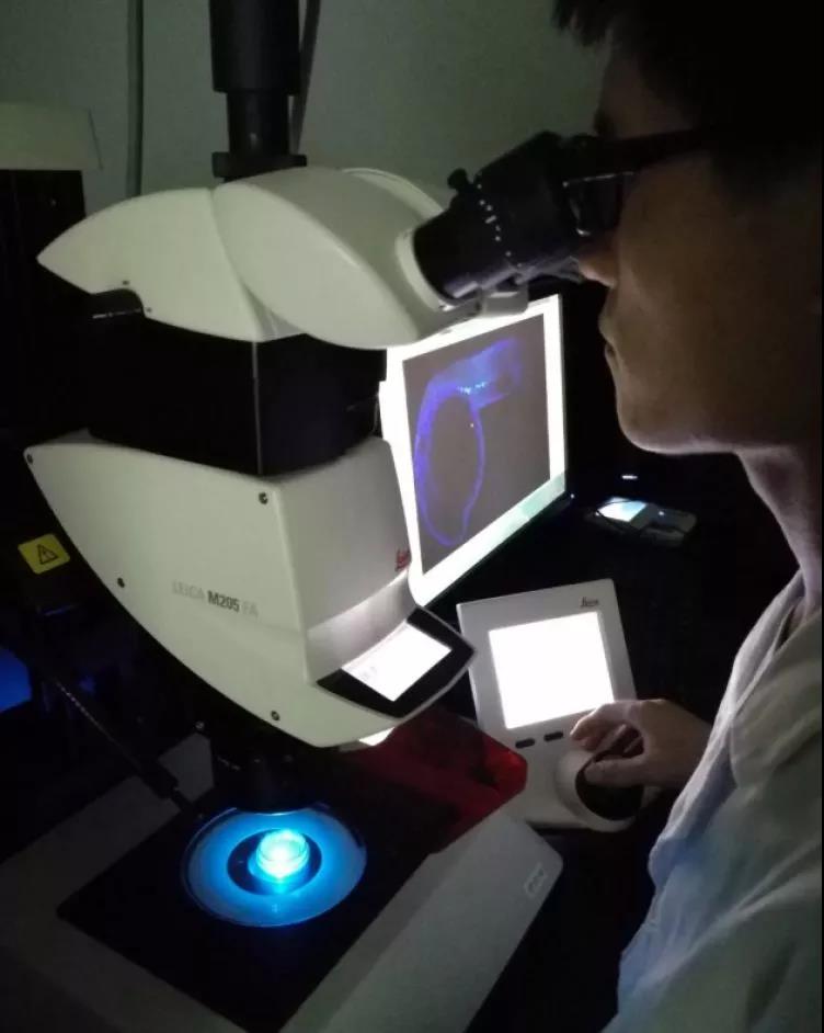 中科院水生生物研究所显微成像实验室,科研人员利用荧光显微镜观察记录斑马鱼胚胎的原始生殖细胞。陶彬彬 摄
