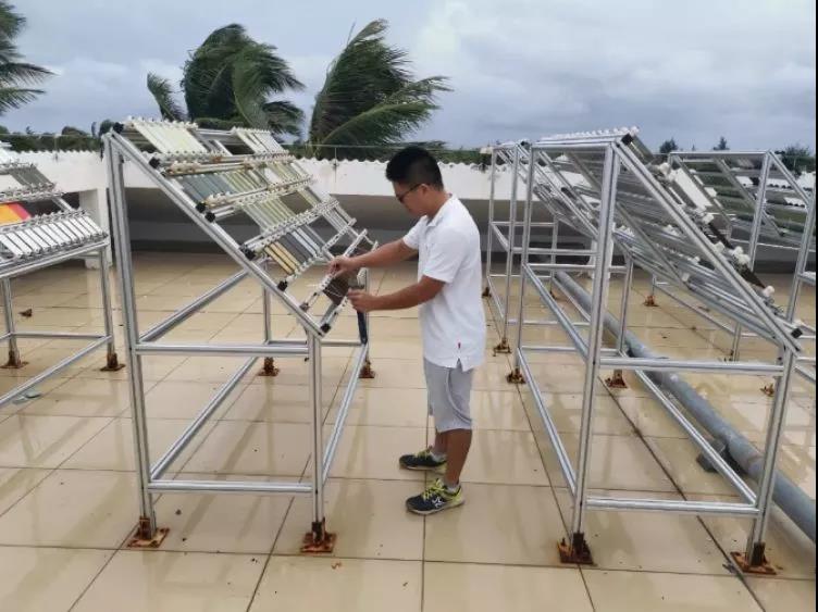 中科院南海海洋研究所西沙海洋科学综合实验站,科研人员对暴晒的材料样品进行加固防范南海东北部热带低压雷雨大风天气。黎大宁 摄