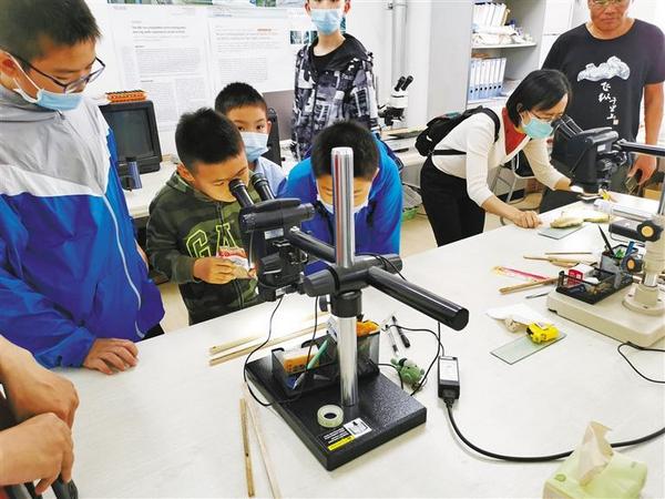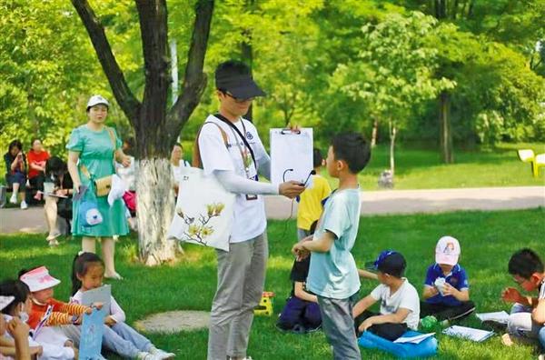 西安植物园科普志愿者指导孩子们进行自然观察。