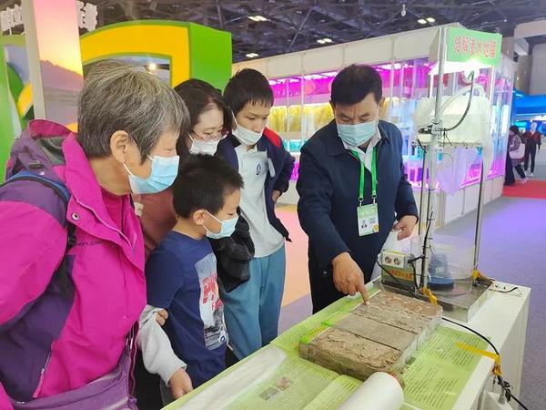 渗水地膜旱作技术发明者山西农业大学研究员姚建民(右一)向观众介绍渗水地膜旱作技术。科技日报记者 马爱平/摄)