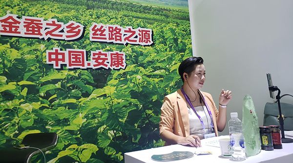 在B馆安康展区,直播带货也是一大亮点。黄开群面对镜头,手拿蚕桑制品,声情并茂地向网友介绍当地的蚕桑产业。“亲们,你们看我手里的这款产品,是我们安康的特色农产品……”坐在直播镜头前,黄开群滔滔不绝,认真地推介每一种农产品。