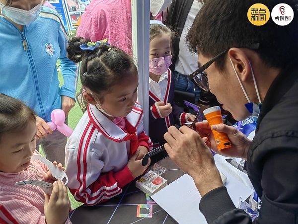 在科普日活动现场的西安光机所光学实验展台前,科普讲解员刘一鸣正给小学生王丽佳讲解光学原理,通过知识讲述与实验互动,让孩子一下子明白了其中的科学原理。