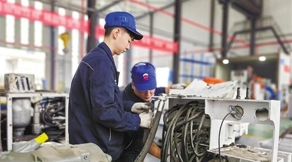 太合智能的定向钻装备“搭乘”中欧班列走向“一带一路”沿线国家。图为工人在调试设备。