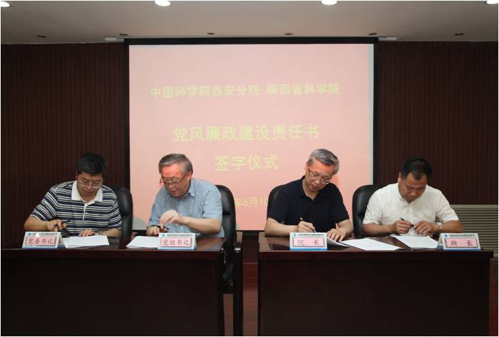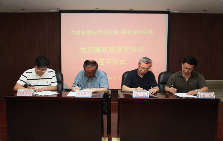 在“依法治国、从严治党”全面推进、“三严三实”专题教育深入实施之际,为了贯彻落实《中国科学院党风廉政建设责任制实施办法》,在“清正廉洁、敢于担当”做新时期合格干部的总体要求下,推进《中国科学院西安分院、陕西省科学院党风廉政建设责任制实施细则》的实施,中国科学院西安分院、陕西省科学院认真部署系统领导干部个性化党风廉政建设责任书的落实工作,6月10日下午,分省院纪检组在西安光机所组织了分省院系统所长(主任)、书记个性化党风廉政建设责任书的签订。活动由党组副书记、纪检组长孙传东主持,院属各单位中层以上领导干部参加。