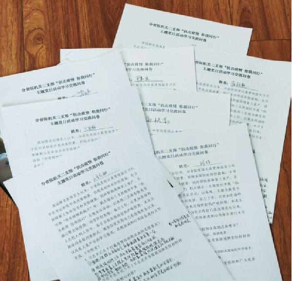 新冠肺炎疫情发生以来,分省院系统认真贯彻落实中科院和陕西省委省政府的决策部署,在积极采取防疫措施,全力保障职工身体健康的同时,积极推进复工复产推进科研创新,督促党员干部立足岗位主动作为。近期,分省院机关第二联合党支部以“抗击疫情 你我同行”为主题开展党日活动,精心设计多种学习形式和活动,强化基层党支部的战斗堡垒作用。