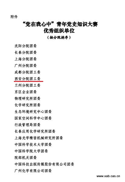 为庆祝中国共产党成立100周年,中科院团委下发了关于开展“党在我心中”青年党史知识大赛的通知,西安分院团工委高度重视、精心组织,先后组织动员系统各单位团员、青年进行了线上及线下党史知识竞赛,充分调动了广大团员青年学党史的自觉性和积极性,掀起了学习党史的热潮。因组织有力、成绩突出,西安分院团工委被中科院团委授予优秀组织奖。