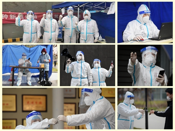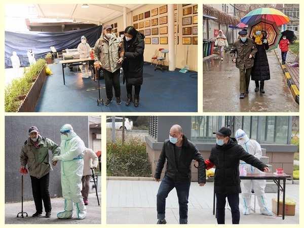 另一部分志愿者精心组织,在微信群里通知各栋楼按楼层有序下楼检测,并在现场进行秩序维护等服务,他们提醒大家保持安全距离,并帮群众解疑答惑、安抚情绪,遇到行动不便的老人,还会主动上前搀扶,帮助老人尽快完成核酸检测,对身体原因不能下楼的老人 志愿者陪同医护逐户上门核酸检测……无数次地重复,紧张而有序,从晨曦朝露到万家灯火,用实际行动诠释了责任担当!居民下楼做核酸检测,大多只花十几分钟,而志愿者们在寒风中一站就是半天。