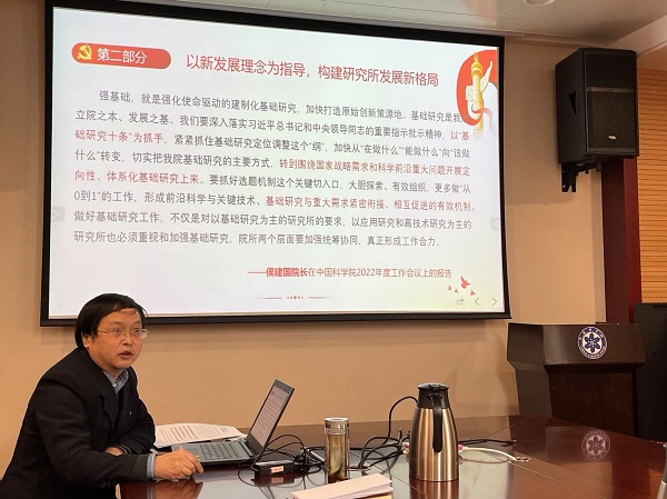 张行勇同志以“思想之光照耀奋进之路 踔厉奋发走向创新高地”为主题,领学了习近平总书记在十三届全国人大五次会议内蒙古代表团的重要讲话精神,带领全体党员全面学习理解了“五个必由之路”的重大论断内涵。学习了侯建国院长在中科院2022年度工作会议报告中关于我院围绕国家战略需求和科学前沿重大问题开展定向性、体系化基础研究的部署要求,系统分析了分省院系统各研究所的学科定位和科研特色,强调贯彻新发展理念构建新发展格局,推进党建工作与科研创新深度融合,以坚定的决心、信心和恒心,走好“必由之路”,以强大的志气、骨气、底气,做到稳大局、应变局、开新局,不断推进我院科技创新高地建设。