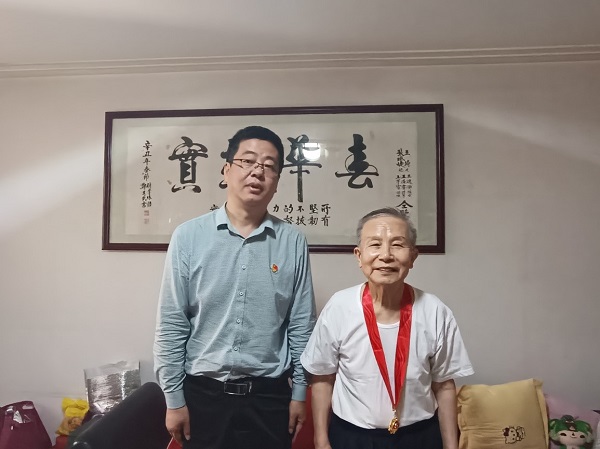 王晓卫庄重地为郑生武研究员佩戴“光荣在党50年”纪念章,李秋娟为老先生献上鲜花即送上党组织的关怀和温暖。