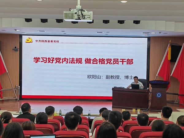 为推动党纪学习教育走深走实,进一步深化党员领导干部思想认识,坚持做到高标准、严要求,切实发挥关键少数示范带动作用,6月19日,中国科学院西安分院 陕西省科学院(简称“分省院”)党组举办党纪学习教育培训班,邀请陕西省委党校(陕西行政学院)副教授欧阳山做专题辅导报告。分省院机关中层领导干部、支部书记、支部委员参加培训。