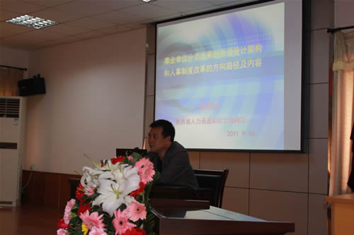 9月23日下午,陕西省科学院举办分类推进事业单位改革政策辅导报告会,特别邀请陕西省人力资源和社会保障厅事业处温新民处长作了题为“事业单位分类改革的顶层设及架构和人事制度改革的方向路径及内容”专题辅导报告。报告会在省微生物所举行,机关各部门负责人、各研究所领导、人事部门工作人员及部分科研人员参加了会议。省科学院党组副书记陈铁成同志主持会议。