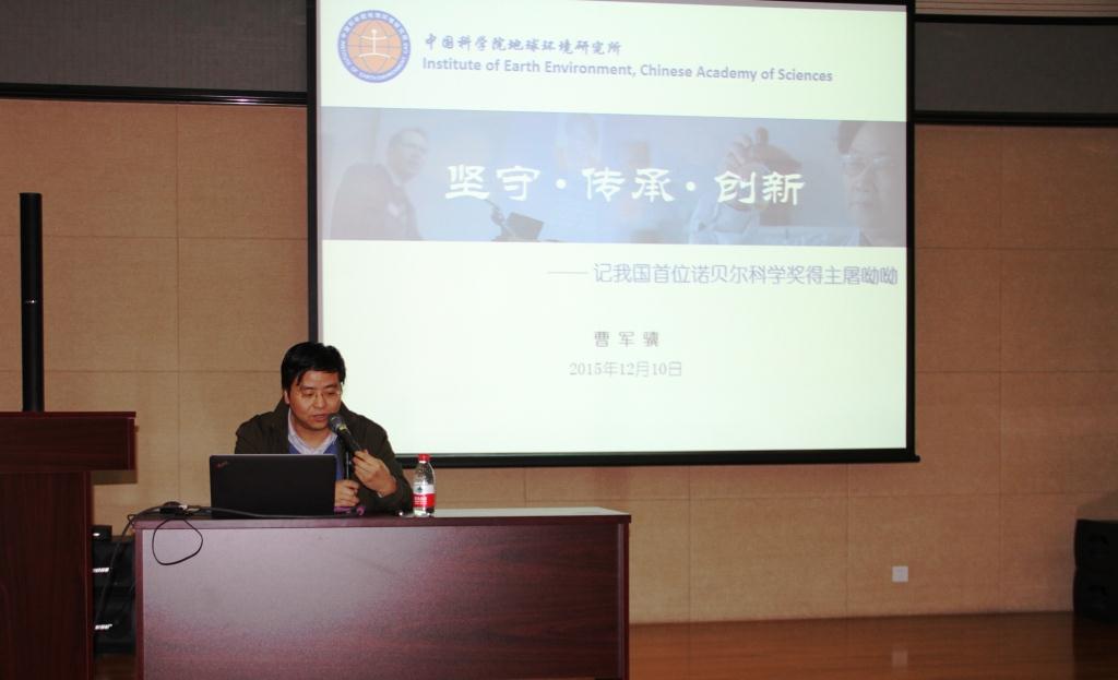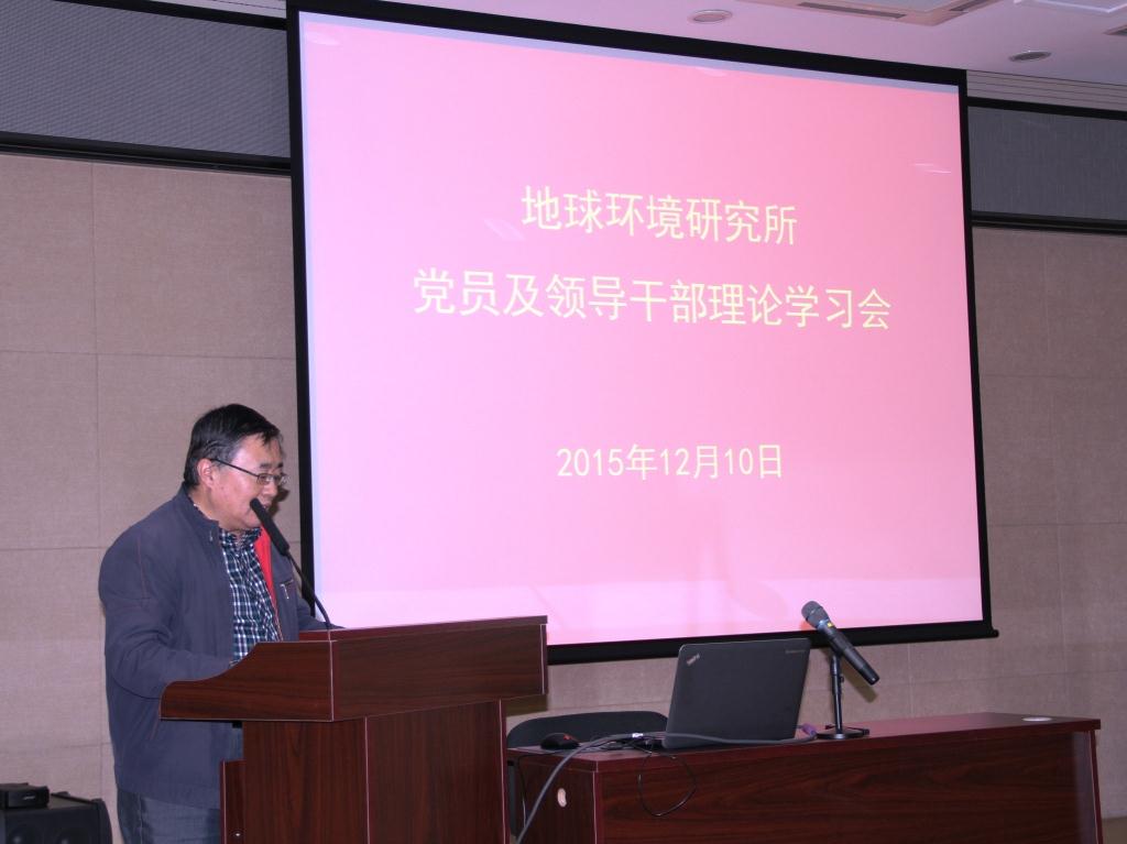 12月10日下午,地球环境研究所党委召开党员及中层干部理论学习会,专题学习党的十八届五中全会精神,并由所党委书记曹军骥同志作了“坚守 传承 创新——学习屠呦呦科学报国精神”党课报告。会议由党委副书记康贸易主持,在所全体党员、离退休党员、中层干部90余人参加了学习会。
