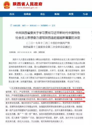 此外,我们还注意到,就在2017年12月,“硬科技”还被写进了陕西省委文件。该份名为《中共陕西省委关于学习贯彻习近平新时代中国特色社会主义思想奋力谱写陕西追赶超越新篇章的决定》的文件这样表述,“扎实推进创新驱动发展。把创新作为建设现代化经济体系的战略支撑,充分发挥我省科教、军工、产业等优势,大力推进创新型省份建设,加快建立以企业为主体、市场为导向、产学研深度融合的技术创新体系。加强科技联合攻关,紧盯制约全省发展的关键性技术,积极参与国家重大科技专项,集中突破核心技术,激活硬科技创新力量,加快形成更多原创性成果。”