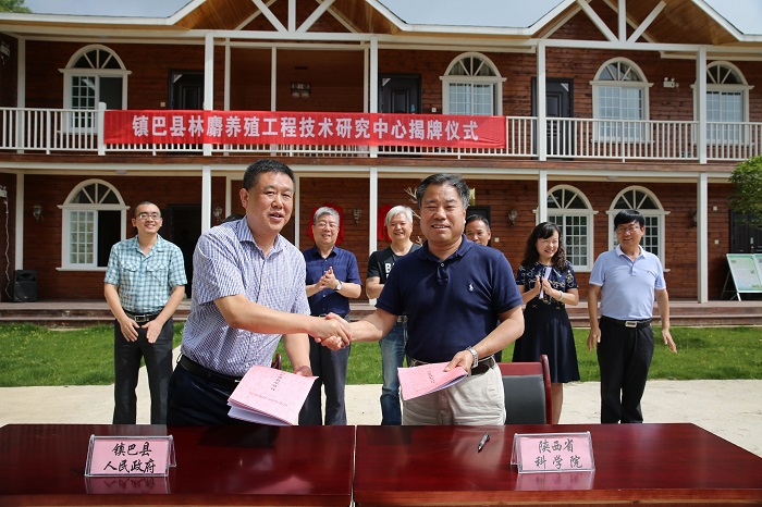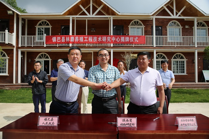 在省院与镇巴县签署科技合作协议的同时,陕西省动物研究所、镇巴县人民政府、陕西国顺农业科技有限公司签署了“汉中市镇巴林麝养殖工程技术研究中心建设合作协议”,三方共同在镇巴县的陕西国顺农业科技有限公司共建开放性的养麝科研中心——“汉中市镇巴林麝养殖工程技术研究中心”,形成林麝养殖产业发展技术平台,以强化和提升示范养殖、科研攻关、技术培训、新产品研发能力。