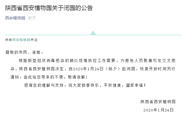随着新型冠状病毒感染肺炎疫情的不断蔓延,陕西省宣布全省进入公共卫生突发事件一级响应机制,西安植物园在1.24日第一时间安排了闭园,对所属商铺(除售卖米面油的商户外)实行暂停营业,取消一切在春节期间计划举办的花事活动和梅花展览活动以及群众性文化活动。新、老园区大门口出入人员、车辆强制管理、防疫与消毒物资准备,领导干部带班调整,所有园级领导立即回到工作岗位,主要领导每日在岗,协调各部门工作进展,值班园领导及一名部门负责人轮流值班,全面负责新老园区各项事宜和疫情防控工作检查与落实。