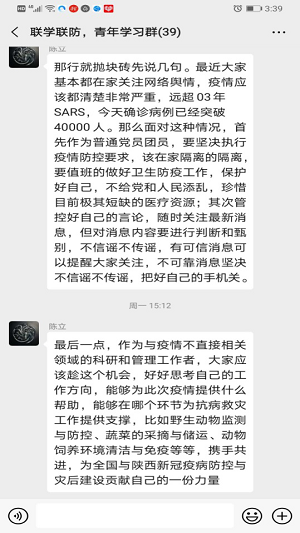 在交流讨论中,大家在分析理解问题、学会信息甄别和思考、结合自身实际如何开展科研工作等方面有了进一步理解、提高。例如,分省院机关青年刘铮在交流中提到这次公共卫生危机中透射出既有正面积极的声音,也有负面消极的“噪音”,认为作为科学院的青年一份子,要学会对每件事情一分为二的去理性分析和看待,正确筛查信息胜于一味的获取信息,不信谣不传谣,不要随意转发网络媒体和大V的文章,积极正确引导家人和朋友科学理性认识肺炎疫情,消除恐慌情绪,营造积极向上的舆论氛围的信念和力量,积极配合政府相关部门和所在单位做好力所能及的的疫情防控工作;省生物农业所冉淦侨博士发言中提到作为科研人员一定要脚踏实地的去做人做事,去做科研。搞应用研究的一定要结合地方和市场需求,去解决实际问题;搞基础研究的,一定要沉下心来,稳扎稳打,钻进去把理论整明白;而不要一味的去追求一些短平快,容易出成果的项目。