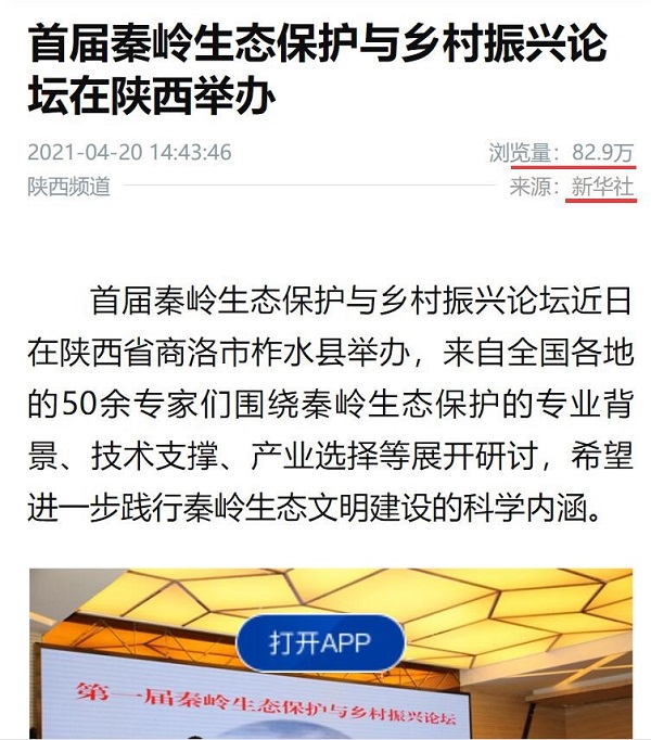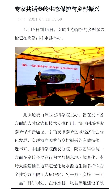 此次论坛旨在深入贯彻落实“绿水青山就是金山银山”的理念,聚智凝力,加强秦岭生态文明建设,做好秦岭卫士,促进秦岭地区绿色发展,助力乡村振兴。此次会议被新华社、科技日报、陕西日报社、中国科学报、陕西政协各界导报、陕西科技报等媒体相继报道,受到社会广泛关注,其中新华社报道阅读量高达82.1万次。