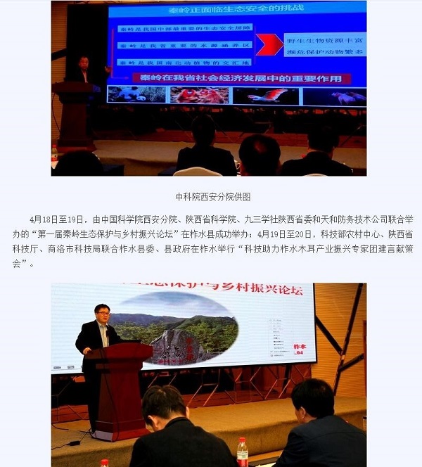 4月18-19日,由中国科学院西安分院、陕西省科学院主办,九三学社陕西省委员会和西安天和防务科技有限公司协办的“第一届秦岭生态保护与乡村振兴论坛”在柞水县成功举办。来自西北大学、西北农林科技大学、陕西省科学院四个研究所、九三学社陕西省委员会、中科院地球环境研究所、牛背梁自然保护区管理局、太白山自然保护区管理局、长青自然保护区管理局和西安天和防务科技有限公司等的专家学者、委员60多人参加论坛。
