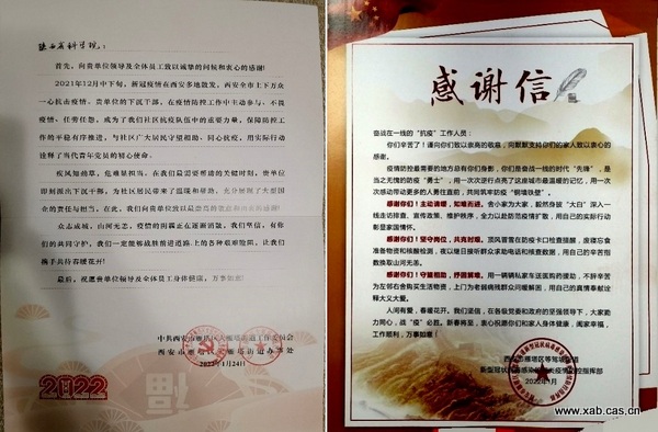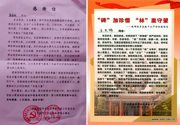 “疾风知劲草,危难显担当。在我们最需要帮助的关键时刻,贵单位即刻派出下沉干部,为社区居民带来了温暖和帮助……”近日,中国科学院西安分院、陕西省科学院(以下简称分省院)陆续收到来自西安市碑林区委组织部、大雁塔、等驾坡、韦曲等多个街道办特殊的“礼物”——疫情防控感谢信,感谢分省院各单位党员干部在新冠肺炎疫情防控的关键阶段挺身而出、伸出援手,参与协助社区的疫情防控志愿工作。