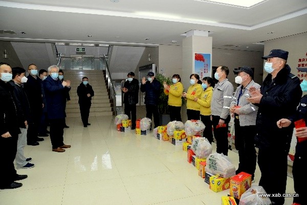 2022年1月30日,在壬寅虎年新春佳节即将到来之际,中国科学院西安分院 陕西省科学院党组书记 院长赵卫,分省院党组成员 副院长杨青春,中科院西安分院分党组成员 纪检组长、陕西省科学院党组成员康贸易,分省院党组副书记詹瑞,分省院副院长陈怡平,对将在春节期间坚守分省院机关后勤的保安 、保洁、 动力维修、车队、食堂、锅炉房等工作岗位的一线员工进行慰问,向这些后勤一线职工及家人致以诚挚的谢意和新春祝福的同时,并送上慰问金和慰问品,以感谢他们在过去一年中为分省院后勤保障工作所付出的艰辛努力和做出的贡献,特别是在此次西安市抗疫期间坚守一线,逆向而行,为保证分省院机关办公运行及所在小区平安做出的重要努力和取得的显著成绩,表示敬意和感谢!