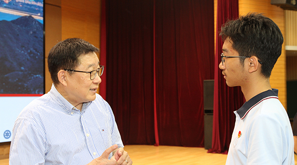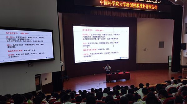 杨国强做题为《多姿多彩的世界-我们生活中的光化学》的科普讲座,用全新的视角、通俗易懂的语言为学生们介绍生活中常见的光化学反应和它们的实际应用以及各种新型材料,从对生活中的事例深入浅出的解析,并展望中国光化学领域发展的前景。他在报告中还结合自己学生时代的学习经历,和高中生们分享了自己高考备战的学习经验,提示同学们要提升专注力,训练提高学习效率。