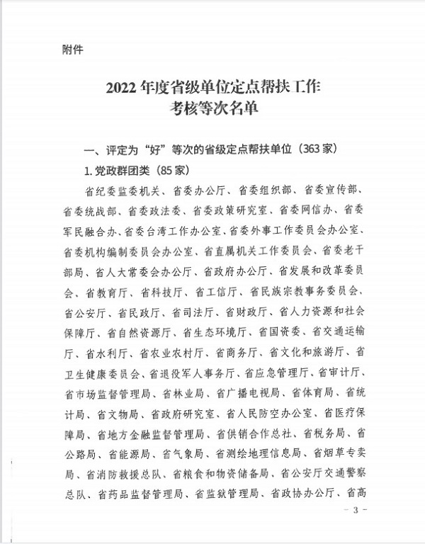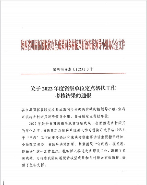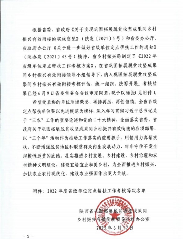 近日,陕西省巩固拓展脱贫攻坚成果同乡村振兴有效衔接领导小组开展了定点帮扶工作考核,自《关于2022年度省级单位定点帮扶工作考核结果的通报》(陕巩衔办发〔2023〕3号)文件获知,中科院西安分院荣获最高等次“好”。