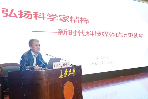 刘峰松以《弘扬科学家精神——新时代科技媒体的历史使命》为题,对中国共产党人的精神谱系与科学家精神的内涵进行了解读,分享了几位著名科学家矢志报国的感人故事,并围绕新时代宣传思想工作的历史使命、科技媒体如何大力弘扬科学家精神等进行了案例分享。