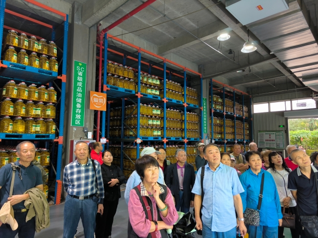 走进爱菊集团 守护“物质粮仓”的匠心与创新:在爱菊集团讲解员的陪同下,老同志们先后参观了葫芦园、稻谷和小麦农产品物流加工园区、油脂加工车间、产品展示馆及爱粮节粮科普馆。作为农业产业化国家重点龙头企业,爱菊集团自1934年(前身为“西安市群众面粉厂”)创立至今,已构建起覆盖“种植-收购-仓储-加工-物流-贸易”的全产业链体系。调研中,老同志们详细了解了企业在粮油储备、质量管控、产品研发等方面的先进经验,对爱菊集团保障粮食安全的举措赞不绝口。