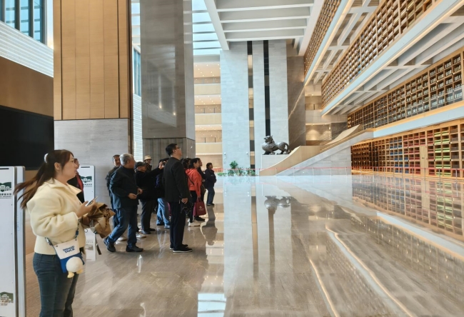 退休老同志们在讲解员带领下,兴致勃勃地参观了西安国家版本馆,详细了解场馆的总体情况和馆藏珍品。西安国家版本馆又称文济阁,座落于西安市鄠邑区,南倚秦岭,北望渭川,主体为高台建筑,呈现出大气磅礴的汉唐风格,是中国国家版本馆的分馆之一,其建筑风格体现了 “山水相融、天人合一、汉唐气象、中国精神” 的设计理念,馆藏版本丰富,涵盖了古籍善本、红色版本、丝路版本等特色专题库,是国家版本资源总库和中华文化种子基因库。