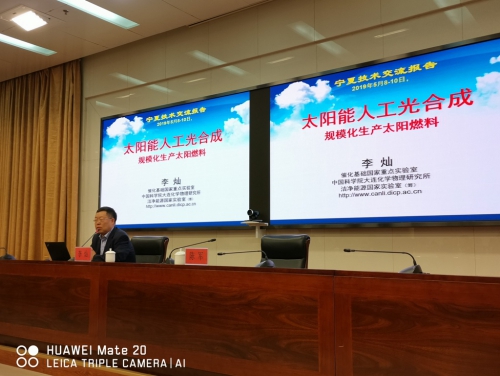在银川,李灿作了“太阳能人工合成规模化生产太阳燃料”专题报告,介绍了合成太阳燃料的背景、技术路径、经济可行性和发展前景,以及目前已在兰州开展的工程示范情况。自治区科技厅,银川市发改委、科技局、工信局,宁东管委会,宁夏大学等相关负责人,神华宁煤、宝丰能源、国家电投集团等企业代表200余人聆听报告。合成太阳燃料技术将为自治区内能源化工企业实现二氧化碳减排,发展环境友好型绿色经济提供切实可行的新路径,大力助推宁夏创新驱动和生态立区战略。报告会后,李灿院士与宁东管委会主要负责人、企业老总和技术专家就人工光合成分解水制氢的技术路线和效率,项目投资、经济产出等进行了深入交流,并与神华宁煤初步达成合作意向。