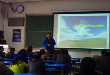 吴晓民在题为“高原精灵—藏羚羊的迁徙与保护”专题报告中,以自己率领科研团队15年来在青藏高原研究藏羚羊保护与青藏铁路工程建设环境评估项目的历程和取得的成果为主线,利用新媒体技术和多媒体播放手段,从藏羚羊分类地位与生物学特性、藏羚羊种群与分布、藏羚羊迁徙之谜、野外科考、卫星跟踪、无人机航测、遗传多样性分析和藏羚羊保护等方面,为同学们展示了课题组人员每年数月坚守在青藏高原无人区的不同观察点踏冰卧雪,进行观察、追踪、探究藏羚羊行为遗传学、繁殖生物学特征及与环境变化的关系,演示了如何利用卫星定位项圈、无人机跟踪调查藏羚羊的活动轨迹和它的种群与分布特点,再到破解其千里迁徙之谜,数千里追踪、发现西藏羌塘藏羚羊大产房的艰辛过程和学术论点争论的科研过程故事;讲述青藏铁路建设期间和建成运营以来国家如何保护藏羚羊等珍稀濒危动物,而它们又是怎样适应与变化的!保护好藏羚羊等青藏高原珍稀动物与栖息地的生态意义。