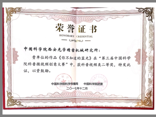 近日,从2017年“互联网+科学传播”培训会暨中科院网络科普联盟业务交流会现场传来喜讯,中国科学院西安光学精密机械研究所报送的科普视频《你不知道的蓝光》,获得中国科学院第三届科普微视频创意大赛二等奖(科普视频类)。该视频由我所白晋周、王芳、肖南三名研究生自编自导自演自制,这是我所首次组织人员参加中科院科普微视频创意大赛。