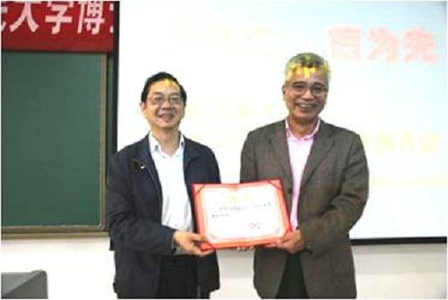 在给该校全体老师作题为《师者仁 德为先》报告前,汉中中学校长文庆华向马石庄教授颁发了聘请其为学校首席科学导师的证书。在报告中,他与全体教师分享了自己作为一个中国科学院大学教师从业30多年的体会和一些感悟,报告深受老师们认同、赞赏。