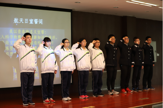 报告后,现场播放了航天主题宣传影片。西安光机所青年骨干薛彬研究员带领学生代表,和现场的学生一起宣誓,学生们立志刻苦学习,锻造科学精神,不断进取,坚定信念,实现人生梦想。随后,汶德胜副所长和杨建峰研究员为学生代表分发了徽章。
