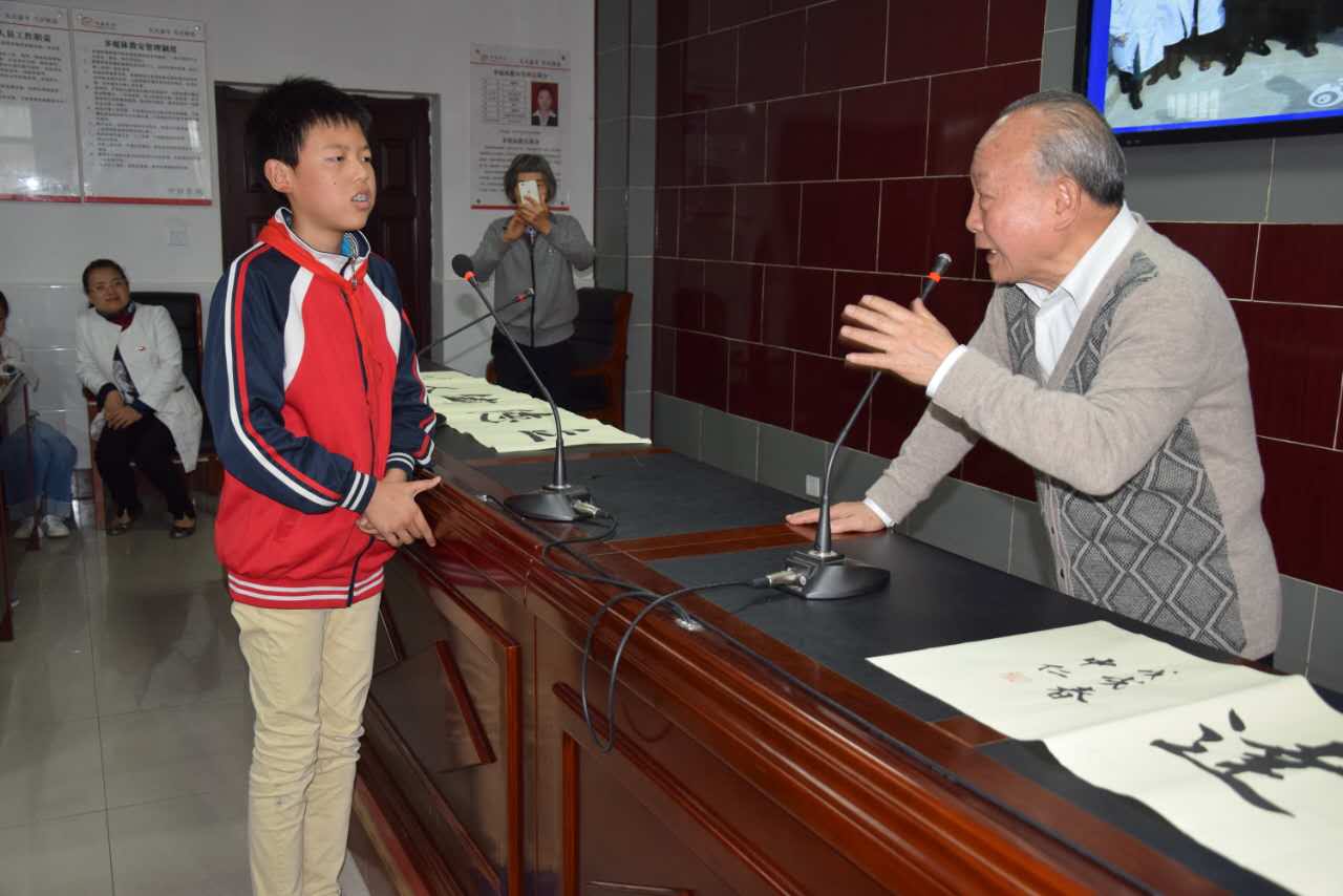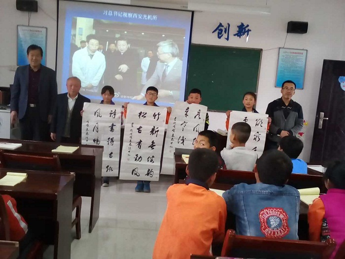 4月24日,年近八旬的陈中仁研究员不顾疲劳,又奔赴到铜川市照金区,在当日上午、下午分别为小丘镇中心小学和小丘镇中学师生分别作了同题报告会,并向两校师生分别赠送了自己的书法作品——“砥砺奋进”、“志强智达”和“厚德载物”、“志存高远”,以勉励为实现中国梦而不懈努力学习。