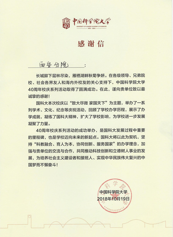 近日,中国科学院大学以“致大尽微 家国天下”为主题,举办了中国科学院大学40周年校庆系列活动并取得了圆满成功。中国科学院西安分院受邀参与了此次活动,并收到了感谢信。在此,分院也向中国科学院大学致以最诚挚的祝福,愿她永远辉煌,永远充满生机!