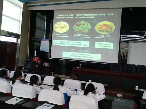 随后,陈中仁又提问大家“嫦娥四号”是什么时间发射的?同学们争先恐后踊跃发言。陈中仁又向师生们讲述了“嫦娥四号”实现了人类航天器首次在月球背面探测,留下了中国足迹的前因后果,和“嫦娥四号”携带植物种子和昆虫卵等进行太空生物实验的情况,并说明其是为以后人类进入月球乃至地外星球生存提供保障的探索试验。大家听的兴趣盎然,一种创新奋进的力量鼓舞着他们。
