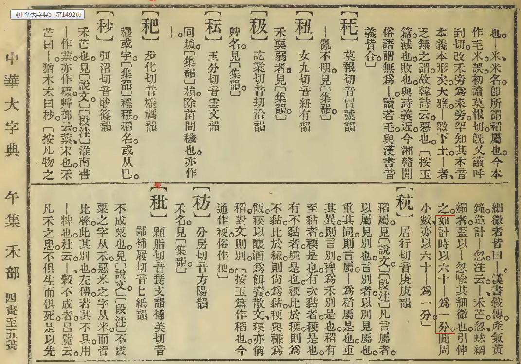 时间“秒”对应于英文“second”。“秒”字在古代指禾芒,也是长度的单位、容积的单位。查询《康熙字典》也没有关于时间秒的解释。再查询《中华大字典》就有关于时间“秒”的定义,虽然与现在的秒定义不同,但也符合当时人们的认识。《中华大字典》1909年开始编纂,1914年编成。可想而知,该词条的录入者是个通达的学者,对西方的科技至少是了解的。不知哪位先贤最先用“秒”来翻译英文的“second”,给先贤点赞!想想当时我中华虽处内忧外患,仍有仁人志士为传承华夏文明火种而紧跟时代步伐默默努力,向前辈致敬!