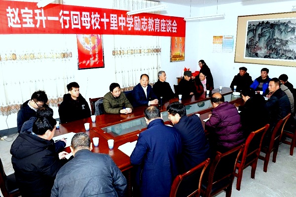 在山阳县十里中学,赵宝升一行首先与山阳县科技和教育体育局领导、十里中学部分老师代表围绕学校的发展现状、校风传承、学生科学素养教育等方面开展座谈。在座谈中,赵宝升回顾了当年的求知历程和老师的倾心教育、关怀,抒发表达感恩之心。