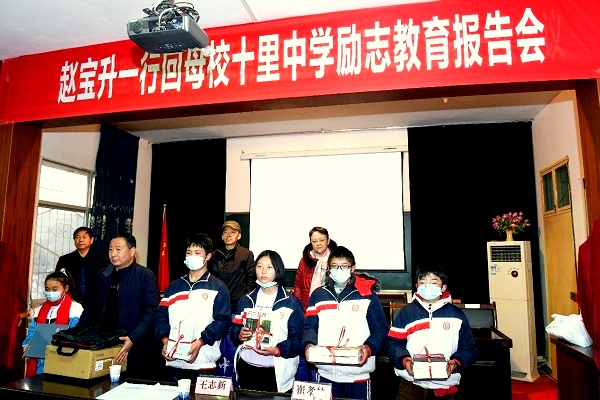 随后,赵宝升为全体师生作题为“知识改变人生命运,科技推动社会发展”的励志教育报告。报告主会场在该校多媒体教室举行,三百多名同学在现场或通过多媒体分教室观看聆听报告。