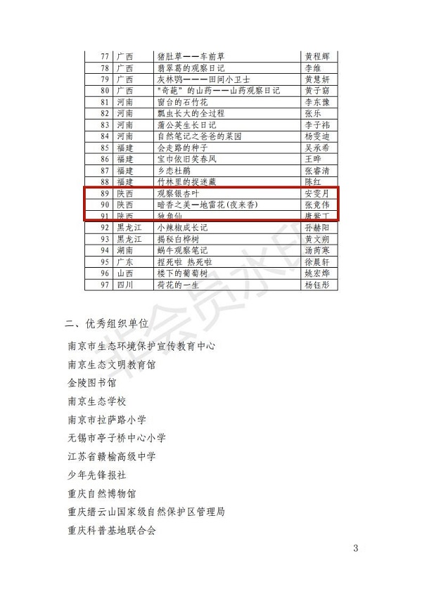 陕西省西安植物园作为本届全国青少年自然笔记征集活动的组织单位,在征集活动启动后通过微信和科普活动进行大力宣传,并积极组织作品评选及报送工作,共报送自然笔记作品13幅,其中3幅作品在最终的全国评选中获奖。