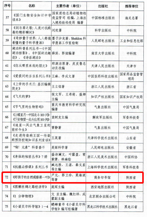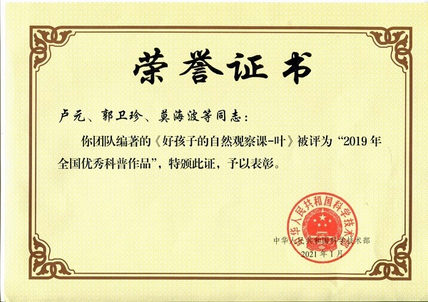 近日,陕西省西安植物园卢元出版的《好孩子的自然观察课-叶》一书获得科技部的“2019年全国优秀科普作品”。