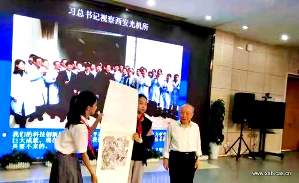 陈中仁还代表中科院老科学家科普巡讲团西安分团向学校、教师赠送自己为学校创作的“宁静致远”“厚德载物”书法作品。(燕子)