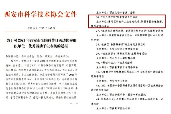 近日,西安市科学技术协会发布《关于对2021年西安市全国科普日活动优秀组织单位、优秀活动予以表扬的通报》,表彰一批优秀组织单位和特色活动优秀单位,其中由雁塔区科技和工业信息化局、陕西省西安植物园、陕西省植物学会联合主办的“万人进校园”科普宣讲系列活动获评2021年西安市全国科普日优秀活动。