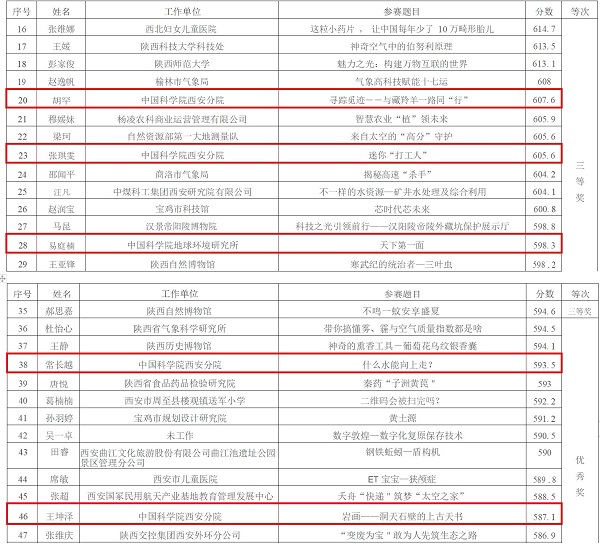 西安分院通过组织第四届分省院科普讲解大赛暨陕西省科普讲解大赛选拔赛,在系统内24名参赛选手中共选拔出6名优秀选手代表分院参加本次大赛。赛前聘请专家对参赛选手进行了集中培训,并高标准录制参赛视频。最终分院共有5名选手获得本次大赛省级奖励,分别是陕西省科普讲解大赛复赛第20名胡罕《寻踪觅迹——与藏羚羊一路同“行”》、第23名张琪雯《迷你“打工人”》和第28名易庭楠《天下第一面》荣获三等奖,第38名常长越《什么水能向上走》和第46名王坤泽《岩画——洞天石壁的上古天书》荣获优秀奖。