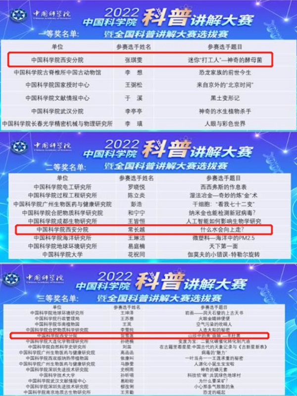 11月9日,由中国科学院科学传播局主办、中国科学院广州分院承办的2022年中国科学院科普讲解大赛总决赛圆满落下帷幕,中国科学院西安分院代表团选送的四名选手分获大赛一、二、三等奖及优秀奖,其中西安分院选手代表张琪雯获得中科院科普讲解大赛一等奖(第一名),目前正全力筹备代表中科院角逐2022年全国科普讲解大赛。西安分院在本次活动中荣获中科院科普讲解大赛优秀组织奖。