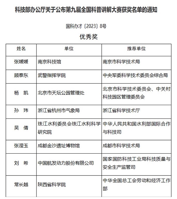 2022年12月21日,由中华人民共和国科学技术部主办的第九届全国科普讲解大赛在广东科学中心举行。经中华全国总工会劳动和经济工作部推荐,陕西省生物农业所青年科研人员常长越代表全国总工会参赛,荣获优秀奖。