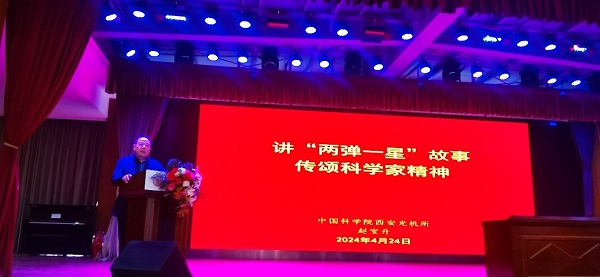 4月24日,我国第九个航天科技日,中国科学院老科学家科普团西安分团团员 中国科学院西安光机所赵宝升研究员为西安市大明宫中学的600多名初中生作题为 “讲‘两弹一星’故事 传送科学家精神”报告。