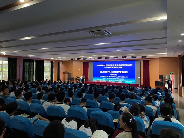 马永清结合科研经历,联系自己团队的科学试验体会,用妙趣横生的现象问题讲解,引起同学们的好奇心。为了让同学们更好地理解植物的“化感作用”,马永清用一棵枇杷树举例,解答了这棵树为什么屡种不活的原因,并阐述了“化感作用”的含义、类别和应用价值。在“根寄生植物”方面,马永清列举了列当的危害,展示自己发现的一种灭除方法——利用植物化感作用“诱捕”列当,使得列当种子以自杀发芽的方式死亡,从而消除以天文数字存在的列当土壤种子库,达到生物防除的目的。